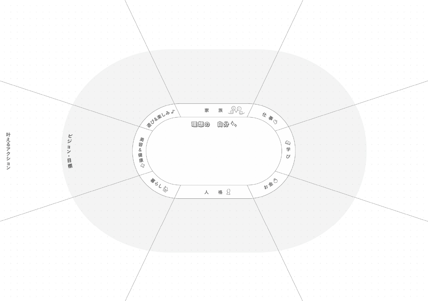 [BEING MYSELF] 1.⼈格 2.⼈間関係 3.パートナー・家族・友⼈ 4.外⾒ 5.健康 6.仕事 7.才能 8.お⾦ 9.住まい・暮らし 10.時間 11.モチベーション 12.⾃分の価値観 [DEFINING MYSELF] 唯⼀無⼆の⾃分の強み・魅⼒ まとめ [VISION MAP] |
