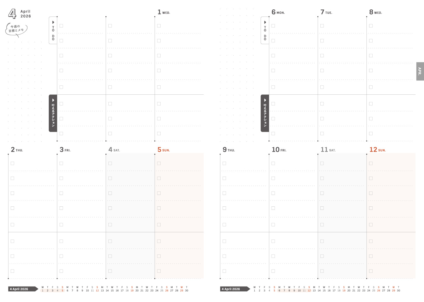 年間スケジュール なりたい自分リスト 理想の自分サークル やらない事リスト 自分年表 マンスリー(六曜あり・月齢あり) 月間ガントチャート 24時間週間バーチカル 5mm方眼メモ |