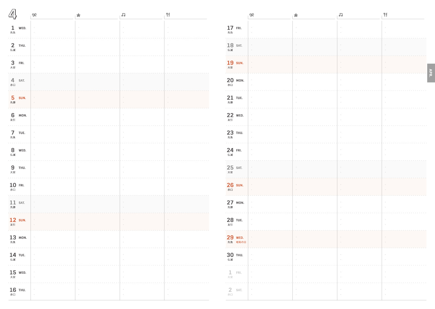 予定を組むのに便利な六曜・月齢も入れてあります。